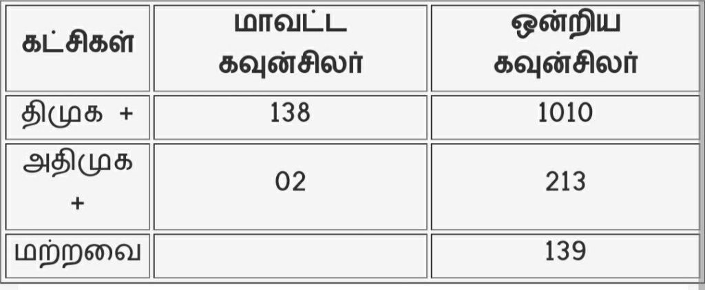 சென்னை: 9 மாவட்ட ஊரக உள்ளாட்சித் தேர்தலில் 1015 ஒன்றிய கவுன்சிலர் இடங்களை திமுக அணியும் 201 இடங்களை அதிமுக அணியும் பெற்றுள்ளன. மாவட்ட கவுன்சிலர் தேர்தலில் திமுக கூட்டணி 138 இடங்களையும் அதிமுக அணி 2 இடங்களையும் பெற்றுள்ளன.